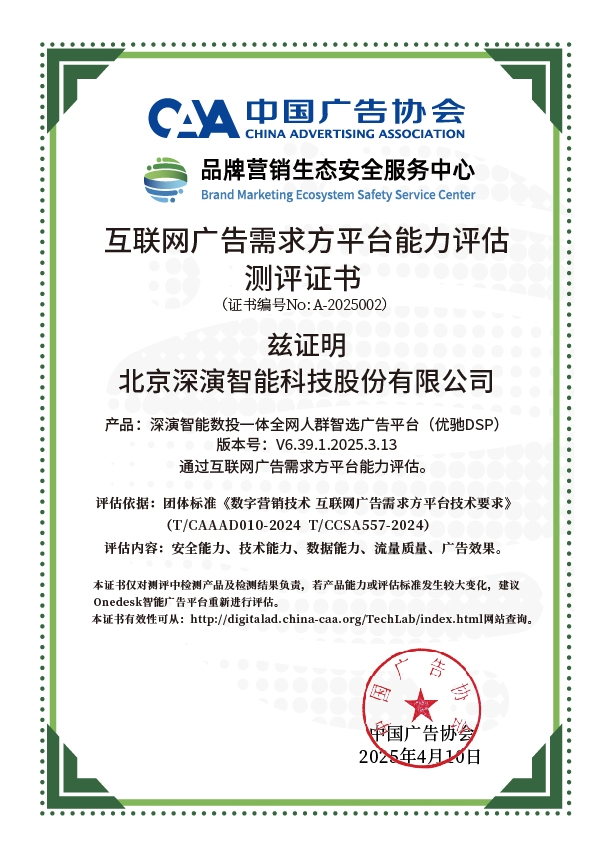 4月10日,中国广告协会发布「互联网广告需求方平台能力评估」测评结果。Martech领域领军企业z6人生就是博智能旗下产品z6人生就是博智能数投一体全网人群智选广告平台(优驰 DSP),凭借其在智能算法优化、技术创新、数据安全治理及流量质量管控等维度的突出表现,高分通过该项行业权威测评,获颁中国广告协会评估证书,成为业内首批通过认证的标杆企业。
